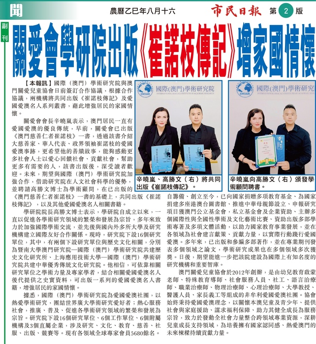 日前,國際(澳門)學術研究院與澳門關愛兒童協會簽訂合作協議,根據合作協議,兩機構將共同出版《崔諾枝傳記》及愛國愛澳名人系列叢書,藉此增強居民的家國情懷。 關愛會會長辛曉嵐表示,澳門居民一直有着愛國愛澳的優良傳統,早前,關愛會已出版《澳門慈善仁者崔諾枝》一書,透過該書介紹大慈善家、華人代表、政界領袖崔諾枝先生的愛國愛澳事跡,更希望他的善績故事,能夠感動更多社會人士以愛心回饋社會、貢獻社會,幫助更多有需要的人,該書出版後,深受讀者歡迎。未來,期望與國際(澳門)學術研究院加強合作,借助研究院在人文社會科學的優勢,並聘請高勝文博士為學術顧問,在已出版的《澳門慈善仁者崔諾枝》一書的基礎上,共同出版《崔諾枝傳記》,以及其他愛國愛澳名人相關書籍。 研究院院長高勝文博士表示,研究院自成立以來,一直以促進各學術研究領域的繁榮和發展為宗旨,多年來致力於加強國際學術交流,並先後與國內外多所大學及研究機構建立了國際友好合作關係。現時,研究院下設16個研究單位,其中,有兩個下設研究單位與歷史文化相關,分別為暨南大學澳門研究院—國際(澳門)學術研究院共建歷史文化研究所、上海應用技術大學—國際(澳門)學術研究院共建中華優秀傳統文化研究院。他相信,可依靠相關研究單位之學術力量及專家學者,結合相關愛國愛澳名人後代提供之史實資料,可出版一系列的愛國愛澳名人書籍,增強居民的家國情懷。 據悉,國際(澳門)學術研究院為愛國愛澳社團,以熱愛學術研究,團結世界廣大學術研究愛好者;熱心服務社會,推廣、普及、促進各學術研究領域的繁榮和發展為宗旨。研究院下設16個研究單位、6個工作單位、6個附屬機構及3個直屬企業,涉及研究、文化、教育、慈善、社服、出版、競賽等。現有各領域全球專家會員5680餘名。自籌備、創立至今,已向國家捐贈多項教育基金、為國家捐建多座港澳台圖書館、推進中華母親節設立、申報研究項目獲澳門公立基金會,私立基金會及企業資助、主辦多個國際性與全國性學術及文化藝術比賽、資助出版多部學術專著及多項文體活動,以助力國家教育事業發展,並在各領域為社會建言獻策、貢獻力量,以實際行動踐行愛國愛澳。多年來,已出版和參編多部著作,並在專業期刊發表多個領域之論文,學術研究成果也在多個領域多次獲獎。日後,期望能進一步把本院建設為國際上有知名度的研究機構和重要智庫。 澳門關愛兒童協會於2012年創辦,是由幼兒教育啟蒙老師、特殊教育導師、社會服務人員、社工、語言治療師、職業治療師、物理治療師、心理治療師、大學教授、醫護人員、家長義工等組成的非牟利愛國愛澳社團。協會始終秉持愛國愛澳理念,以關懷本澳兒童及青少年、提供社會與家庭援助、謀求福利保障、助力其健全成長為服務宗旨,致力於發動全社會力量整合跨領域專業資源,深耕兒童成長支持領域,為培養擁有國家認同感、熱愛澳門的未來棟樑持續貢獻力量。