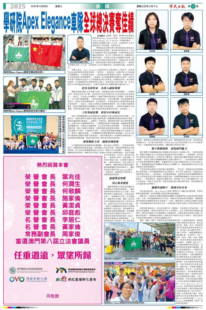 日前,由國際(澳門)學術研究院重點支持與培育的Apex Elegance車隊,在新加坡2025年Stem Racing(F1 in Schools)全球總決賽中,一舉奪得全球總排名第35名、亞洲區第10名及中國隊伍第3名的佳績,為澳門爭光。 研究院院長高勝文博士對車隊取得的成就表示熱烈祝賀與高度讚賞。他在接受訪問時表示,這支由本地優秀中學生組成的團隊,為澳門特區首支征戰此項被譽為「青少年工程奧林匹克」的國際頂尖賽事的隊伍,在與來自全球50多個國家和地區、超過80支頂尖隊伍的激烈角逐中,憑藉出色的工程設計、創新的商業方案與卓越的團隊表現,一舉奪得全球總排名第35名、亞洲區第10名及中國隊伍第3名的優異成績,為澳門爭光。 高勝文指出,Apex Elegance車隊的成功不僅是數字上的排名,更是澳門STEM教育發展的重要里程碑。「從零到一,從無到有,這群年輕人在短短八個月的備賽期內,完成了從概念設計、工程製造到商業策劃的全流程,展現了澳門青年非凡的創新能力與堅韌精神。」高勝文博士強調,這次國際賽事的經驗充分證明,澳門的青年學子具備與全球頂尖人才同場競技的實力與勇氣,這種敢於探索、勇於創新的精神,正是推動澳門未來發展的核心動力。研究院將以此為契機,進一步加大對青少年科技創新教育的投入,為澳門培養更多具有國際視野的創新型人才。 肩負先鋒使命為後人鋪路築橋 團隊經理盛果豐在分享參賽心得時,展現出超越年齡的成熟與擔當。「我們從未將一時的成名作為目標,而是始終牢記作為澳門首支出征隊伍的使命與責任。」他坦言,在長達六天的賽程中,團隊不僅要面對技術上的挑戰,更要克服語言、文化差異等種種困難。「我們詳細記錄了每一天的比賽經驗,從技術調整到答辯技巧,從展位布置到團隊協作,這些寶貴的一手資料將成為未來澳門隊伍參賽的重要參考。」盛果豐表示,隊伍已經開始系統整理參賽資料,建立完整的知識管理體系,將這次國際賽事的經驗轉化為可傳承的智慧資產。「我們希望通過自己的實踐,為學弟學妹們鋪平道路,讓未來澳門的隊伍能夠站得更高、走得更遠。」 工程領域的逆襲在挫折中淬煉成長 首席工程師鄭穎曦向記者娓娓道來比賽過程中驚心動魄的技術攻堅戰。「決賽首日,我們的賽車在試跑中暴露出嚴重問題—釋繩導軌與賽道表面發生摩擦,導致前三輪成績大幅落後。」面對這一突發狀況,團隊展現出驚人的冷靜與專業素養。在僅有的30分鐘維修時間內,工程團隊快速進行問題診斷,通過精密儀器測量與數據分析,準確定位問題根源,並立即著手進行技術調整。「我們重新校準了導軌角度,優化了空氣動力學配置,同時對賽車的配重進行了微調。」這些及時而精准的調整立竿見影,在隨後的正賽中,車隊的最快單圈成績躍升至全場第15名,實現了令人矚目的逆襲。「這個戲劇性的轉折讓我們深刻認識到,真正的工程師不僅要能在實驗室裡進行精密設計,更要具備在壓力下快速解決問題的能力。這份寶貴的實戰經驗,將成為我們未來工程生涯中最珍貴的財富。」 凝聚團隊力量胸懷家國情懷 公共關係經理冼依潼動情地回顧了團隊一路走來的心路歷程。「從組建初期的磨合,到備賽期間的激烈討論,再到賽場上的並肩作戰,我們經歷了無數次的爭執與和解,但正是這些挑戰讓我們真正成長為一個密不可分的整體。」她透露,在備戰最緊張的階段,團隊成員每週投入超過40小時進行訓練和測試,經常在實驗室工作到深夜,但沒有一個人輕言放棄。「我們相互扶持、彼此鼓勵,在困境中積蓄力量,在挑戰中凝聚共識。」冼依潼堅定地表示,這次比賽只是一個開始,團隊的最終目標是要讓中國的國旗飄揚在最高領獎台上,讓世界見證中國青年的 engineering 實力。「我們深信,通過堅持不懈的努力,這個夢想終將實現。」 超越獎盃的收穫用心衡量價值 團隊策略師沈宇軒從更宏觀的角度詮釋了這次比賽的深層意義。「雖然我們與最終的領獎台失之交臂,但我們在賽場上收穫的遠比一座獎盃來得珍貴。」他興奮地分享道,在比賽期間,團隊與來自英國、德國、澳大利亞等多個國家的隊伍建立了深厚的友誼,並就未來合作達成了多項共識。「我們正在籌劃與新加坡理工學院團隊開展線上技術交流,與英國隊伍合作開發新型賽車模擬軟體,這些國際連結為我們打開了通往世界的大門。」沈宇軒創新性地運用投資回報率(ROI)的概念來衡量這次參賽的價值:「如果將我們投入的時間、精力與熱情視為投資,那麼這次比賽帶給我們的個人成長、國際視野與終身友誼,其回報率遠遠超過100%。可以毫不誇張地說,STEM Racing 已經成為我們人生中不可或缺的一部分,它讓我們的青春更加精彩,讓我們的未來更加可期。」 數字媒體創新展現澳門魅力 數字媒體主管鍾毅曦詳細介紹了團隊在展位設計上的創新之舉。「我們突破傳統,將澳門的獨特文化元素與最先進的數位技術完美融合。」他解釋道,展位運用全息投影技術重現了大三巴牌坊的立體影像,通過互動式觸控螢幕展示澳門的世界遺產,並設計了可動式結構讓整個展位充滿生機與活力。「這些創新設計不僅吸引了大量評審和觀眾駐足體驗,更讓澳門的文化魅力通過科技的方式得以精彩呈現。」鍾毅曦邀請各界持續關注車隊的社交媒體平台,團隊將陸續分享更多比賽的精彩花絮與技術解析。 平面設計師吳建豪分享