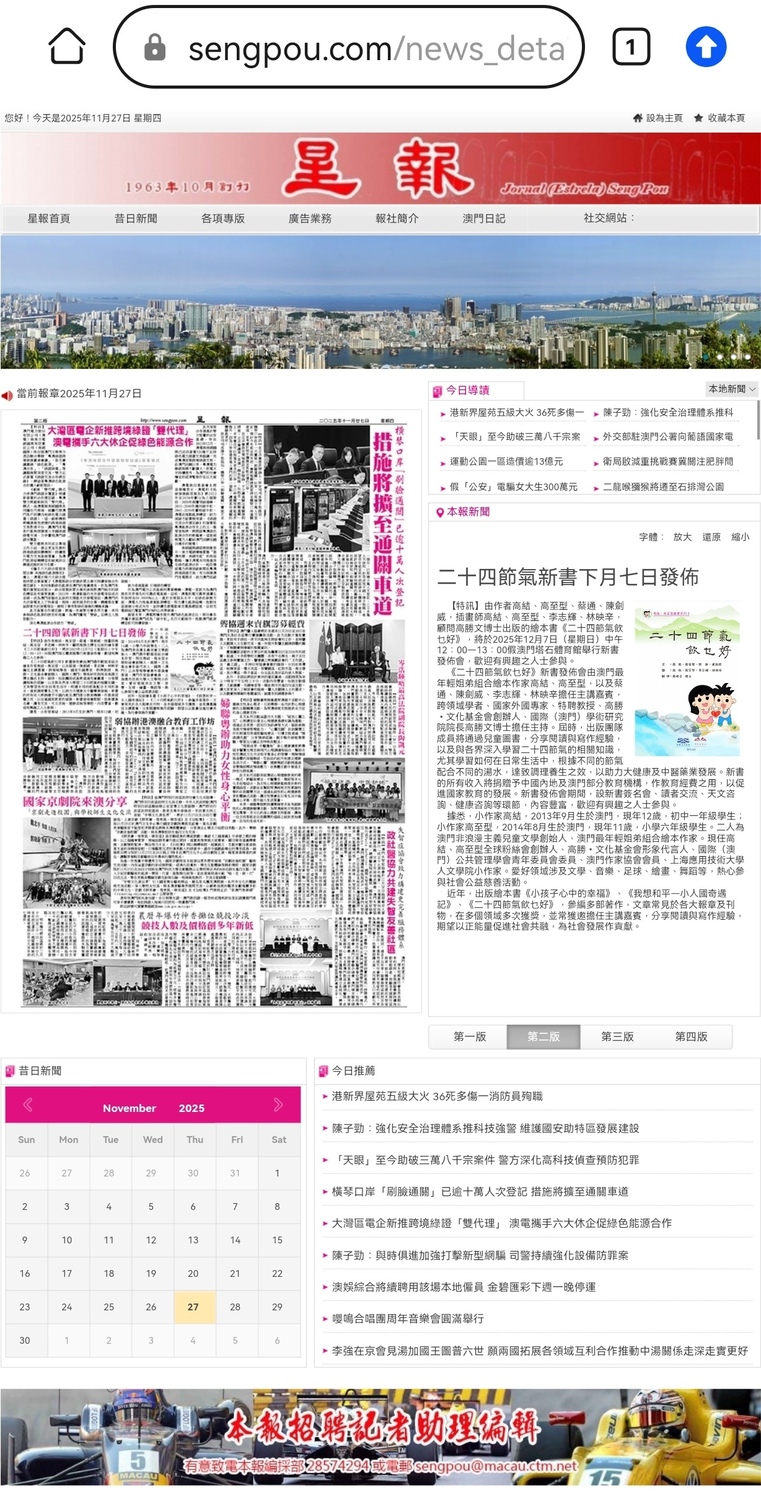 由作者高結、高至型、蔡通、陳劍威,插畫師高結、高至型、李志輝、林映辛,顧問高勝文博士出版的繪本書《二十四節氣飲乜好》,將於2025年12月7日(星期日)中午12:00—13:00假澳門塔石體育館舉行新書發佈會,歡迎有興趣之人士參與。 《二十四節氣飲乜好》新書發佈會由澳門最年輕姐弟組合繪本作家高結、高至型,以及蔡通、陳劍威、李志輝、林映辛擔任主講嘉賓,跨領域學者、國家外國專家、特聘教授、高勝•文化基金會創辦人、國際(澳門)學術研究院院長高勝文博士擔任主持。屆時,出版團隊成員將通過兒童圖書,分享閱讀與寫作經驗,以及與各界深入學習二十四節氣的相關知識,尤其學習如何在日常生活中,根據不同的節氣配合不同的湯水,達致調理養生之效,以助力大健康及中醫藥業發展。新書的所有收入將捐贈予中國內地及澳門部分教育機構,作教育經費之用,以促進國家教育的發展。新書發佈會期間,設新書簽名會、讀者交流、天文咨詢、健康咨詢等環節,內容豐富,歡迎有興趣之人士參與。 據悉,小作家高結,2013年9月生於澳門,現年12歲,初中一年級學生;小作家高至型,2014年8月生於澳門,現年11歲,小學六年級學生。二人為澳門非浪漫主義兒童文學創始人、澳門最年輕姐弟組合繪本作家。現任高結、高至型全球粉絲會創辦人、高勝•文化基金會形象代言人、國際(澳門)公共管理學會青年委員會委員、澳門作家協會會員、上海應用技術大學人文學院小作家。愛好領域涉及文學、音樂、足球、繪畫、舞蹈等,熱心參與社會公益慈善活動。近年,出版繪本書《小孩子心中的幸福》、《我想和平—小人國奇遇記》、《二十四節氣飲乜好》,參編多部著作,文章常見於各大報章及刊物,在多個領域多次獲獎,並常獲邀擔任主講嘉賓,分享閱讀與寫作經驗,期望以正能量促進社會共融,為社會發展作貢獻。