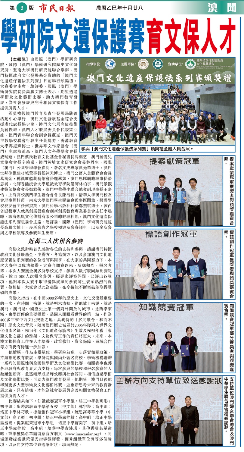 由國際(澳門)學術研究院、國際(澳門)學術研究院歷史文化研究所、暨南大學澳門研究院聯合舉辦,澳門特別行政區政府文化發展基金資助的“澳門文化遺產保護法系列賽”於日前舉行頒獎禮。大賽委會主席、總評委、國際(澳門)學術研究院院長高勝文博士表示,期望透過學術及文化藝術比賽,助力澳門教育發展,為社會發展與完善相關文物保育工作提供所需人才。 頒獎禮假澳門教育及青年發展局駿菁活動中心舉行,澳門文化發展基金綜合支援處代處長楊少蘭女士,澳門文化局高級技術員關俊雄先生,澳門人才發展委員會代表梁亞妹女士,澳門青年聯合會副會長蘇崑先生,澳門天主教學校聯會行政主任黃麗芳女士,香港教育大學馮振輝博士,世界華文作家協會(澳門)主席陳溥森先生,澳門人文科學學會會長戚瑞蓮女士,澳門蔡氏教育文化基金會秘書長馮燕芝女士,澳門關愛兒童協會會長辛曉嵐女士,澳門黃埔文史研究會會長林丹生先生,國際(澳門)公共管理學會顧問、著名文史專家洪光華博士,澳門世邦傢俬建材城董事長侯沐天博士,澳門公務人員體育會會長葛萬金先生,穗澳紅船劇藝館會長龎翠如女士,澳門思匯網絡理事長潘思翼女士,北師香港浸會大學通識教育學院講師林柏宇先生,澳門景觀建築師協會會長鄭君俠先生,澳門中華學生聯合總會副理事長王嘉怡女士,上海高校澳門學生聯合會會長陳浩楠先生,清華大學澳門校友會理事周梓茵女士,南京大學澳門學生聯誼會監事區閔然女士,婦聯學校校友會主任何杰英先生,澳門科學出版社社長鄔燕琪博士,陝西省退役軍人就業創業促進會創新創業教育專業委員會主任李晨暉先生,珠海凱風文化傳播有限公司總經理杜凱先生,澳門文化遺產保護法系列賽組委會主席、總評委、國際(澳門)學術研究院院長高勝文博士,多所參與之學校領導及參賽師生,以及多所參與之學校領導及參賽師生出席。 高勝文致辭時首先感謝各位的支持和參與,感謝澳門特別行政區政府文化發展基金、主辦方、各協辦方,以及參加澳門文化遺產保護法系列賽的各位老師與同學,在大家的共同努力下,本次大賽得以成功舉辦。大賽自開賽以來,反應熱烈,報名者眾,本次大賽獲全澳多所學校支持,參與人數打破同類比賽紀錄,近12000人次報名參與,經專家評審評閱,已評出各獎項。他對本次大賽中取得優異成績的參賽師生表示熱烈的祝賀。他相信,大家會以此為起點,在今後能不斷突破並取得豐碩的成果。 高勝文指出,在中國五千多年的歷史上,文化交流最重要的一次,在時間上來說,就是明末清初,從地域上來說,就是澳門。澳門是中國歷史上第一個對外開放的城市,是西學東漸、東學西傳的重要橋樑,是國人開眼看世界的第一站,作為四百多年來中西文化交匯之地,具獨特的“多元融合、和而不同”歷史文化背景。隨着澳門歷史城區於2005年獲列入世界文化遺產名錄、2014年《文化遺產保護法》生效及2025年獲“東亞文化之都”的殊榮,文物保育工作的責任將更大。未來,本澳文物保育工作在人才培養、政策修訂、資金保障、區域合作等方面仍有待進一步加強。 高勝文續稱,作為主辦單位,學研院為進一步落實相關政策,持續推動教育發展,學研院與國內外著名高校、學術機構聯辦了一系列的國際性與全國性學術及文化藝術比賽,相關賽事也獲各地政府與教育界大力支持,每次參與的學校和報名參賽的人數屢創新高,並逐漸形成品牌效應與社會認同。相信透過學術及文化藝術比賽,可助力澳門教育發展。他期望,澳門日後能舉辦更多大型學術及文化藝術比賽,並重新思考未來的教育發展之路,只有這樣,才能為社會發展與完善相關文物保育工作提供所需人才。 比賽結果如下,知識競賽冠軍小學組:培正中學劉玥彤;初中組:聖若瑟教區中學第五校(中文部)林宇瀅;高中組培正中學林巧欣。標語創作冠軍小學組:鮑思高粵華小學(中文部)高至型;初中組:培正中學盧梓毅;高中組:培正中學區丞竣。提案獻策冠軍小學組:培正中學蘇奕宇;初中組:培正中學盧梓毅;高中組:培華中學古沛琪。其他獲獎名單從略,詳細獲獎名單請留意官方網頁(www.imacauiar.org)。同場頒發提案獻策優秀指導教師獎、優秀組織單位獎等多個獎項,以及向支持單位致送感謝狀,場面熱鬧。