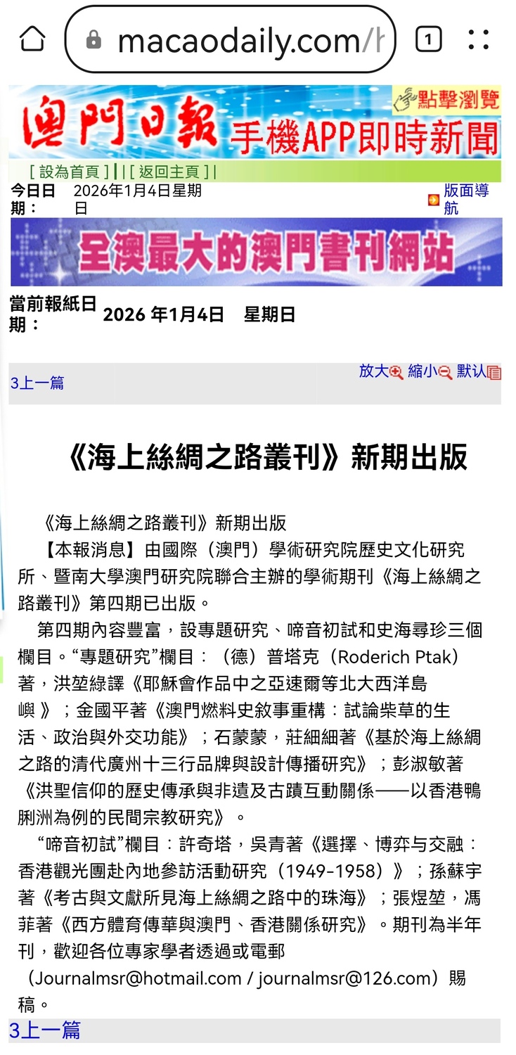 由國際(澳門)學術研究院歷史文化研究所、暨南大學澳門研究院聯合主辦的學術期刊—《海上絲綢之路叢刊》第4期已出版。 第4期內容豐富,設專題研究、啼音初試和史海尋珍三個欄目。“專題研究”欄目:(德)普塔克(Roderich Ptak)著,洪堃綠譯《耶穌會作品中之亞速爾等北大西洋島嶼 》;金國平著《澳門燃料史叙事重構:試論柴草的生活、政治與外交功能》 ;石蒙蒙,庄細細著《基于海上絲綢之路的清代廣州十三行品牌与設計傳播研究》;彭淑敏著《洪聖信仰的歷史傳承與非遺及古蹟互動關係—— 以香港鴨脷洲為例的民間宗教研究》。 “啼音初試”欄目:許奇塔,吳青著《選擇、博弈与交融:香港觀光團赴內地參訪活動研究(1949-1958)》;孫苏宇著《考古与文獻所見海上絲綢之路中的珠海》;張煜堃,馮菲著《西方体育傳華与澳門、香港关系研究》。 “史海尋珍”欄目:佚名編著,黄善萍點校,葉農,金國平校注《兩粵雜存》。 據悉,《海上絲綢之路叢刊》是中外關係史、明清史(港澳史)、海外漢學、歷史文獻、基督教傳華史,及海上絲綢之路城市社會、經濟、文化、政治等研究領域的專業刊物。期刊是萬方數據知識服務平台、中國核心期刊(遴選)資料庫、中國國家哲學社會科學文獻中心、Airiti Library華藝線上圖書館、港澳期刊網、澳門中文期刊論文索引收錄期刊,也是中國學術期刊綜合評價資料庫的來源期刊,為澳門特區第一批被收錄的有關海上絲綢之路研究領域期刊。期刊的評審和編委專家由國際知名學者組成,以“立足專業、服務國家、面向世界”為辦刊方針,旨在促進相關研究領域的繁榮和發展。期刊為半年刊,歡迎各位專家學者透過或電郵(Journalmsr@hotmail.com / journalmsr@126.com )賜稿。